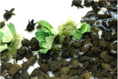 绿卡黄喉拟水龟苗选用珠江水系与广西北仑河的野生黄喉拟水龟进行选育,选择特征明显、个体大的黄喉拟水龟南方种群为亲本,采用群体选育和家系选育的方法,对引进的良种亲本经严格的检验检疫,选取符合标准的亲本,分池隔离标记进行强化培育,最大限度地保持和利用原种亲本的优良性状。“绿卡牌”黄喉拟水龟苗体质健壮、神态活泼、体色自然、双眼有神、体表光洁、抗病能力强、生长速度快 -